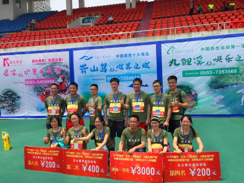 3000多人激情开跑,闽东医院选派出15名长跑健将参加迷你马拉松团体赛,赛程约5公里,经过比拼,终获团体第一名,充分展示了团结协作、积极向上、执着追求、顽强拼搏的精神。此外,陈振华、刘建平、卓石树、朱炜分别获得男子组第2名、第6名、第8名、第9名,林雪球、谢丽平分别获得女子组第4名和第8名的佳绩。